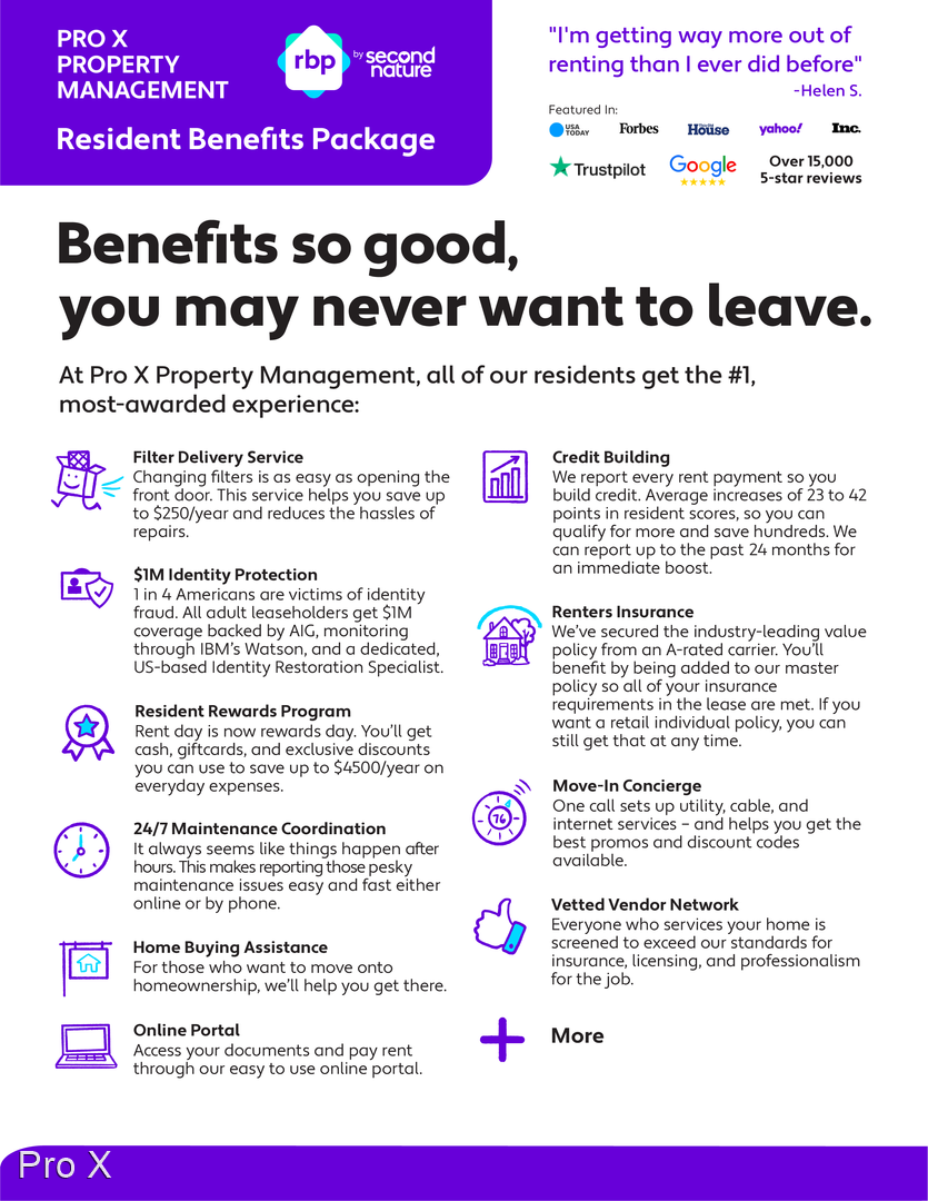 All Pro X Property Management residents are enrolled in the Resident Benefits Package (RBP) for $35.00/month which includes renters insurance, HVAC air filter delivery (for applicable properties), credit building to help boost your credit score with timely rent payments, $1M Identity Protection, our best-in-class resident rewards program, and much more! Renter’s insurance is a requirement to rent from Pro X.