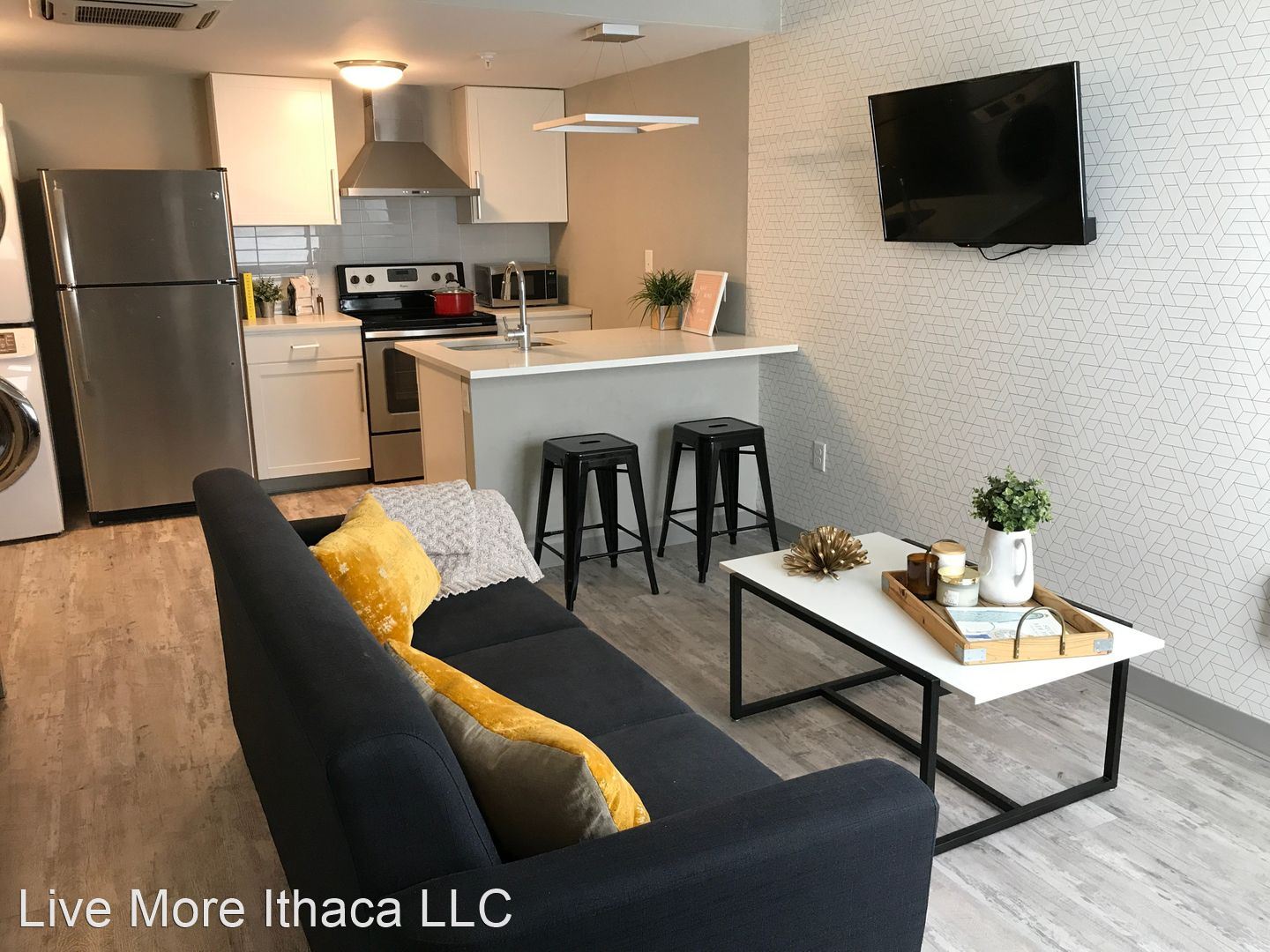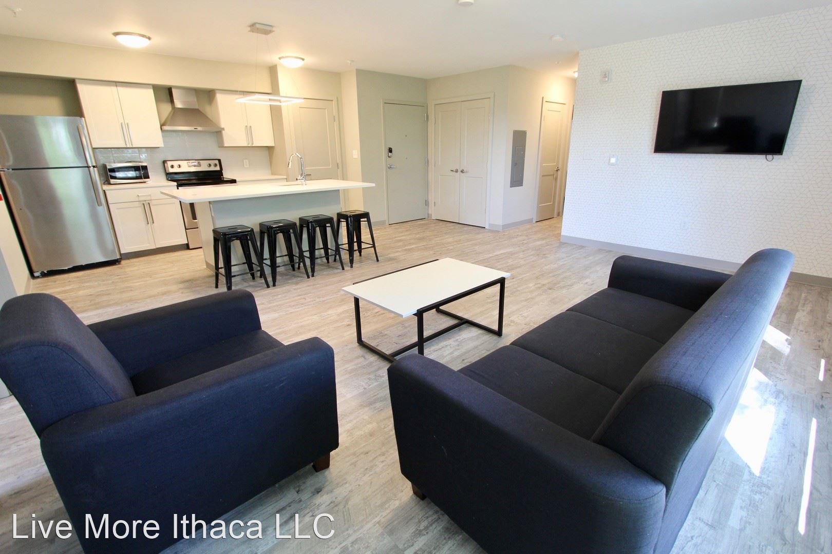 Our pet-friendly apartments come fully furnished and include a full XL bed frame and mattress, armoire, desk, and chair, under bed storage in each bedroom. In the common area, we include, a couch, loveseat and/or armchair, coffee table, bar stools, and a mounted smart TV. All appliances are included including a dishwasher and an in-unit washer and dryer.