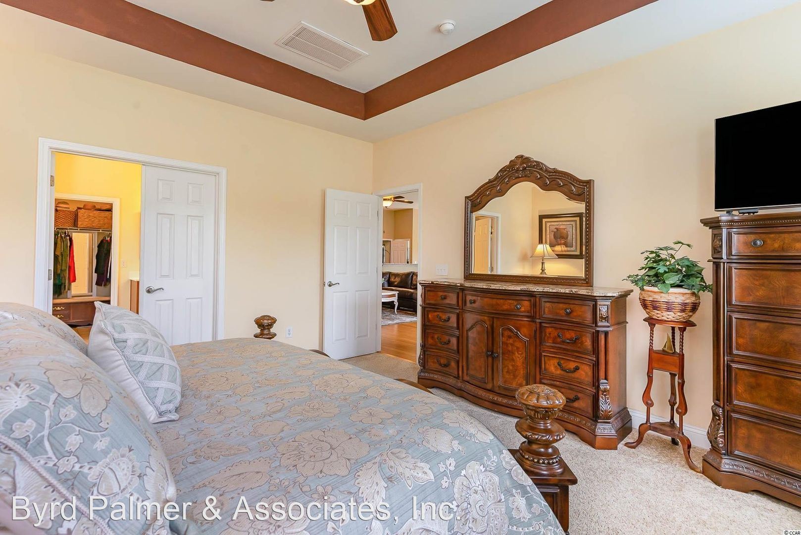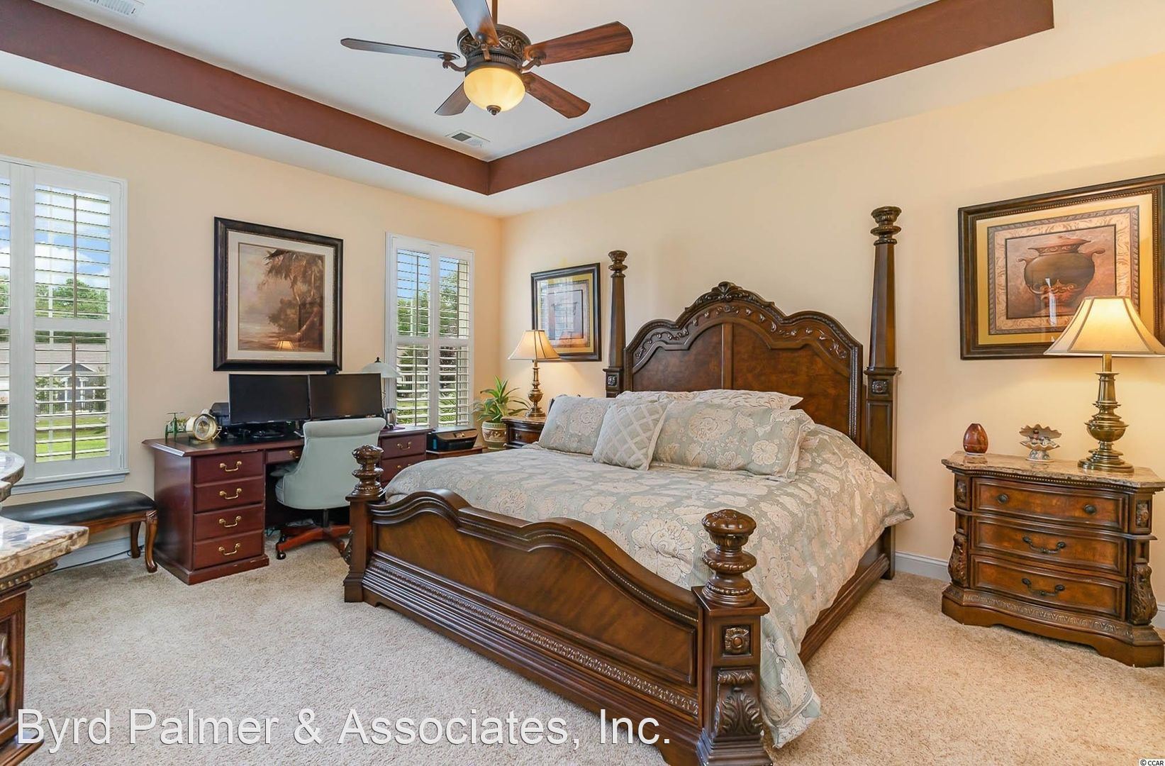 Master suite with walk-in closet, tray ceilings, and en-suite bath (oversized soaking tub, walk-in shower, double sink vanity). Two good sized guest bedrooms and full bath with plenty of storage space throughout.