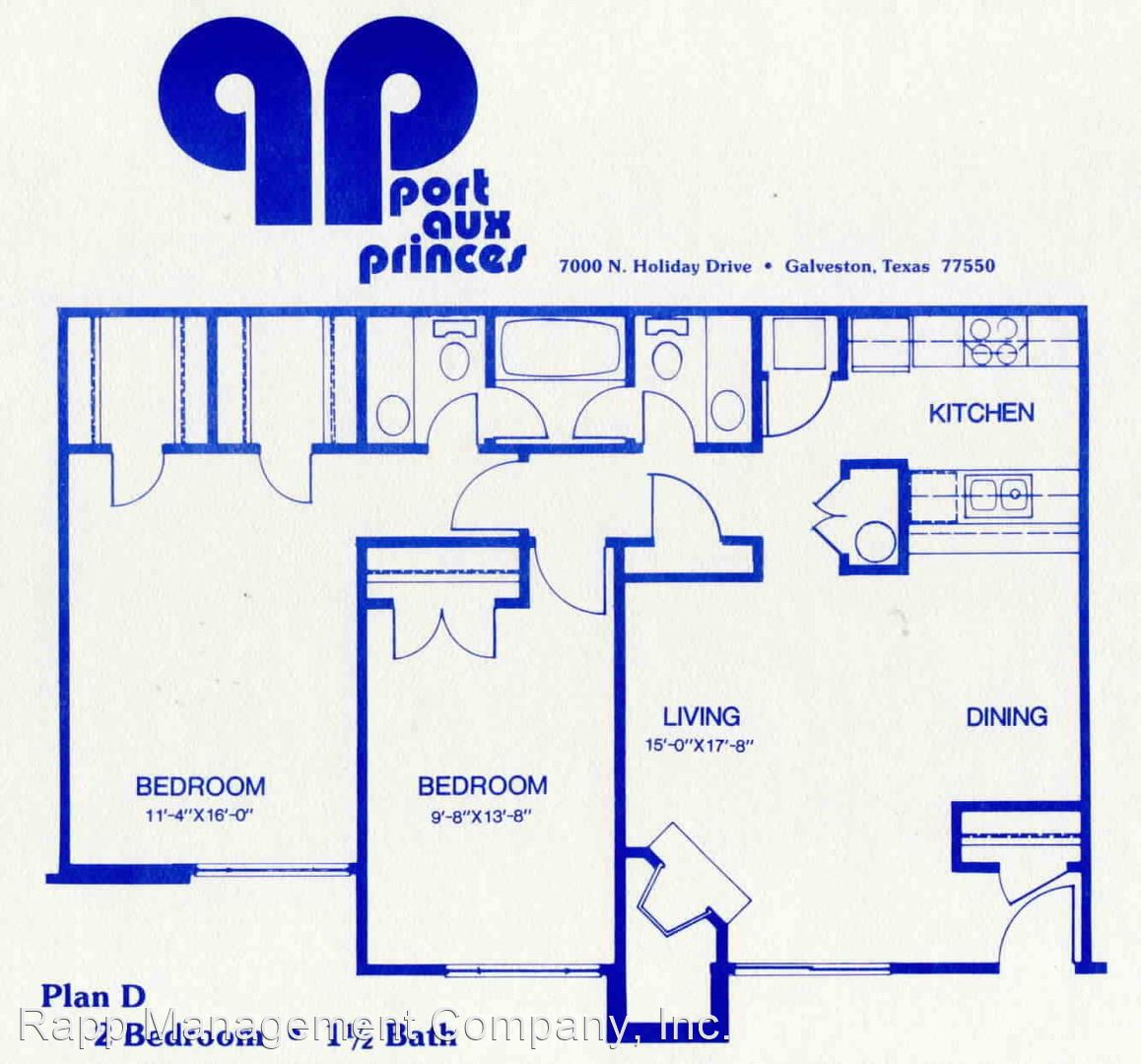 Port Aux Princes Condominium- Two bedroom unit - 2nd floor condominium unit at Port Aux Princes, wood/brick exterior, near UTMB, 2 bedrooms, 1 1/2 baths, living room w/fireplace, dining area, kitchen, electric stove, refrigerator, diswasher-disposal, closet laundry, washer, electric dryer, fully carpeted, walk-in closets, carport, electric central air / heat, ceiling fans, swimming pool, smoke alarm, utilities paid by tenant.